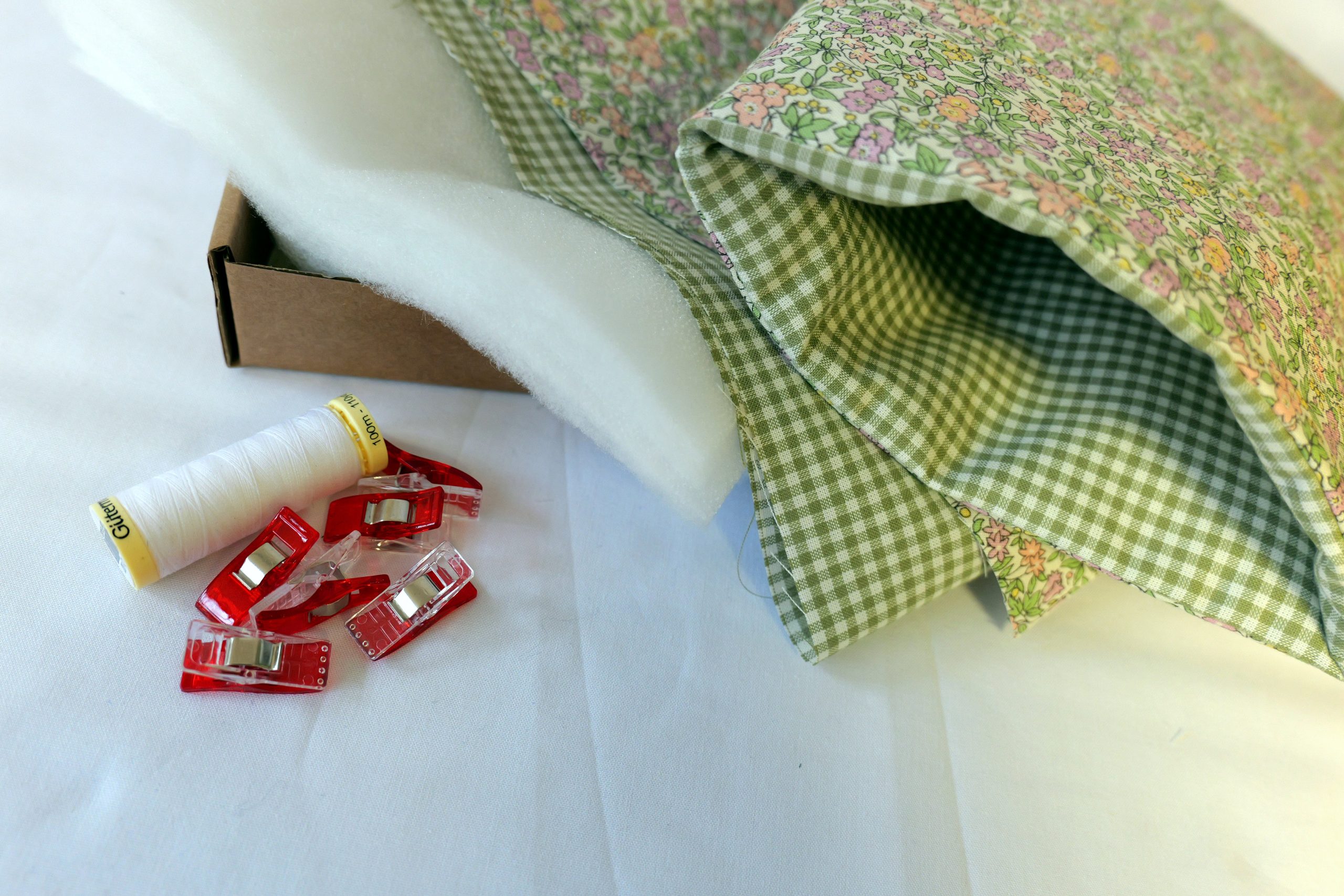 Kit contains 2 x 100% cotton rectangles measuring approx. 21 x 26cm in floral Liberty, 2 x 100% cotton rectangles measuring approx. 21 x 26cm in green gingham, 4 pieces of fusible fleece (100% polyester) measuring approx. 19 x 24cm, 1 x 100m Gütermann Sew All Thread in 000 White (100% polyester), 6 quilting clips and instruction leaflet.