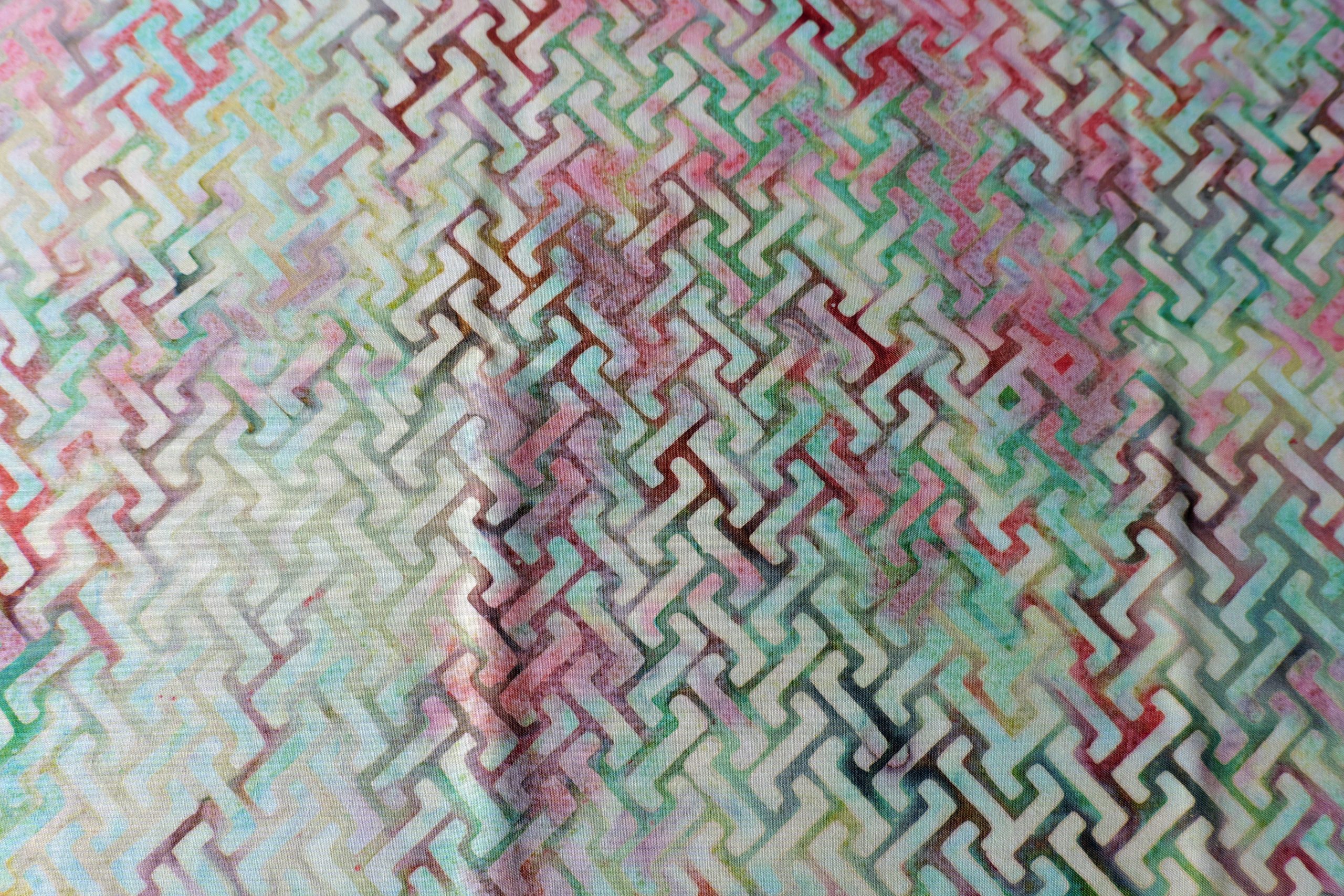 Burgundy, blue and green fabric with a zigzag print, this Hoffman Fabrics fat quarter is from their Bali Batik Handprints range. 100% cotton – quilting weight.