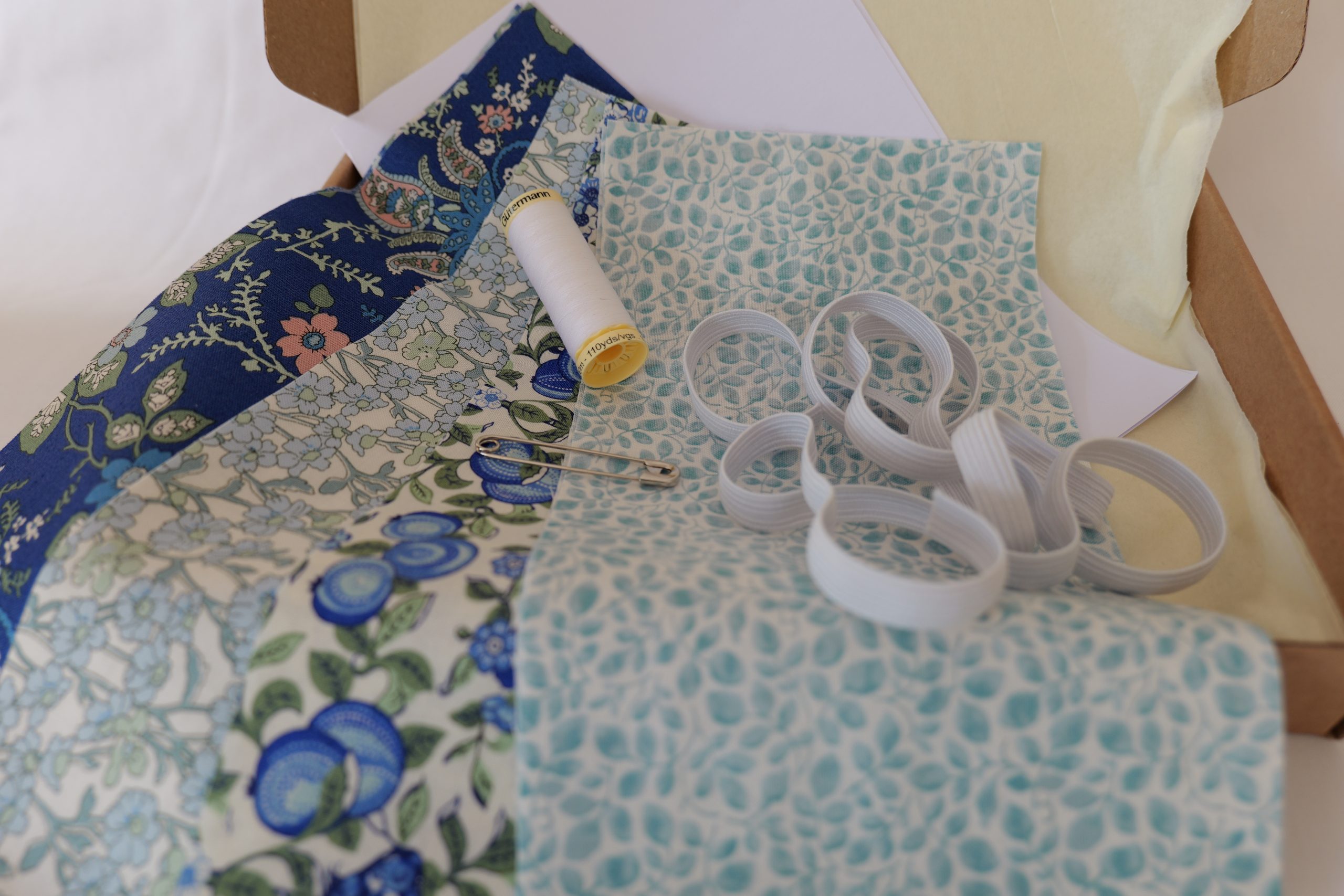 The ‘Beautiful In Blue’ kit contains 4 x 100% cotton fabric strips measuring approximately 50 x 10cm*, 1 metre of 9mm wide white elastic (70% polyester, 30% latex), 1 x 100M Gütermann Sew All Thread in 000 white (100% polyester), safety pin and instruction leaflet.