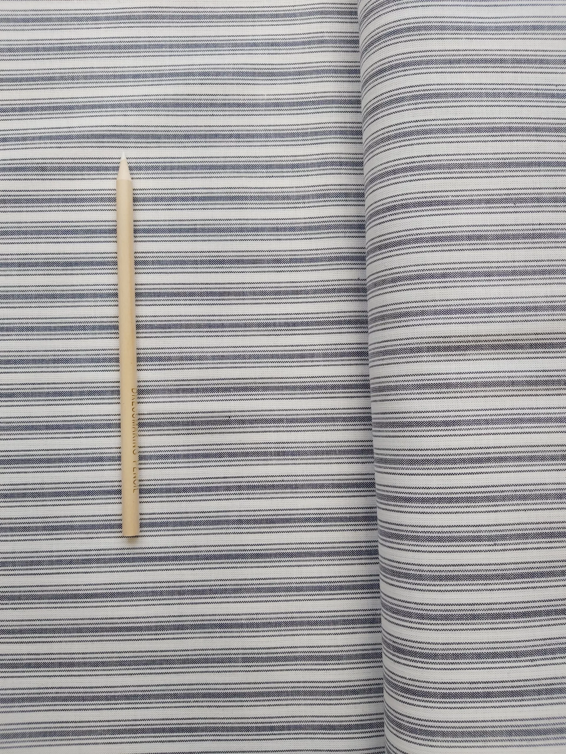A woven print in navy blue and white stripe design suitable for both dressmaking and quilting projects.