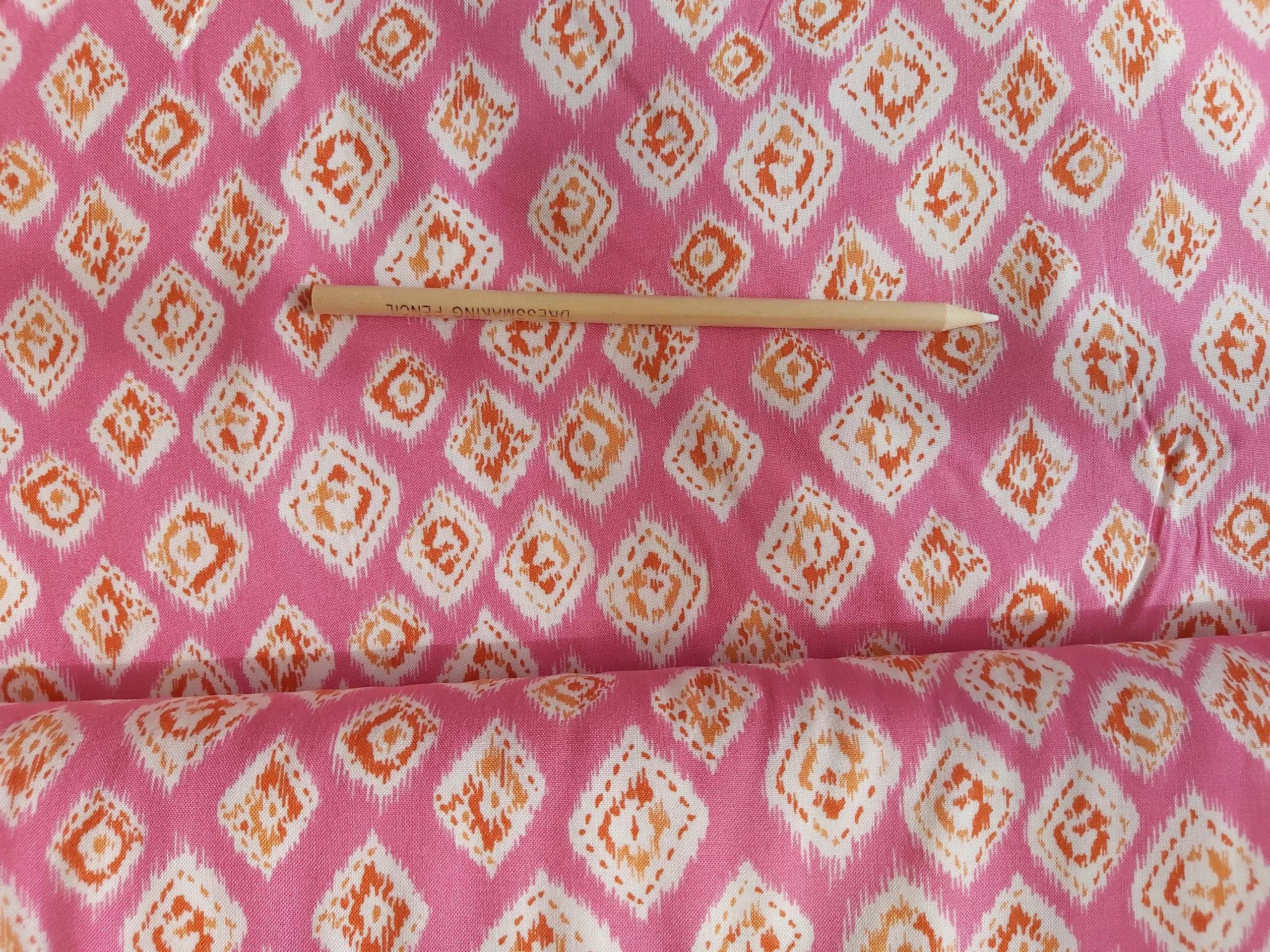 100% Viscose Pink (Fuchsia) with Orange and White diamond print